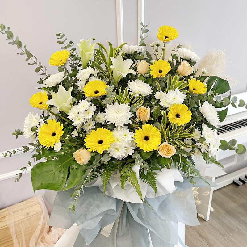 A dignified funeral flower stand showcasing vibrant Yellow Gerbera paired with delicate Madonna Lily, pristine White Chrysanthemum and White Chrysanthemum Pompom varieties. Accented with Roses and lush greenery, it stands approximately 175cm high, offering a sincere and uplifting tribute for memorial services.
