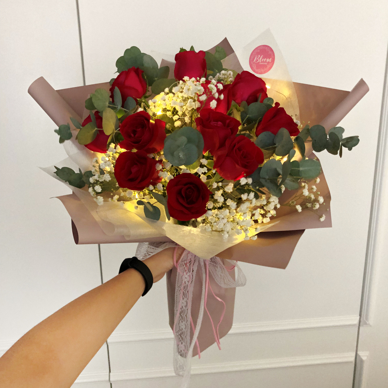 This arrangement of Red Roses with soft Baby’s Breath makes an elegant statement for any sincere event and evokes ageless passion.