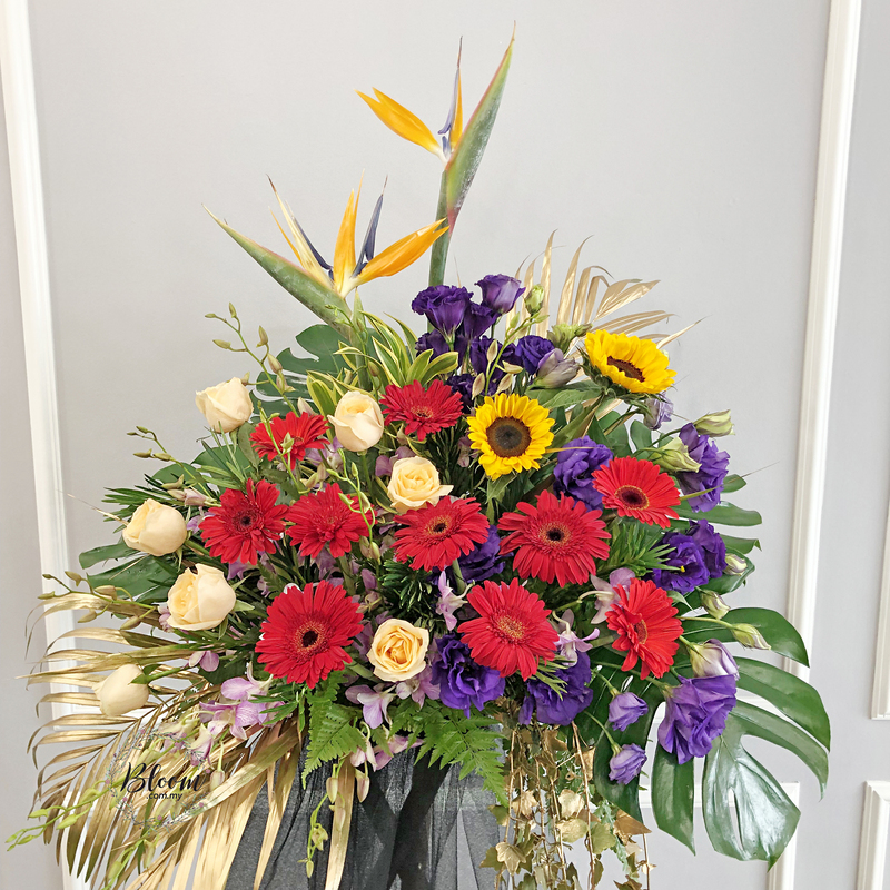Celebrate the new beginnings with this impressive floral stand which showcasing exotic Bird Of Paradise, Champagne colour Roses, fiery Red Gerberas, Orchids, Sunflowers and regal Purple Eustomas. The mix of textures and hues brings a dynamic yet refined presence which ideal for marking special occasions. Measuring approximately 180cm in height, it delivers a memorable & uplifting statement.