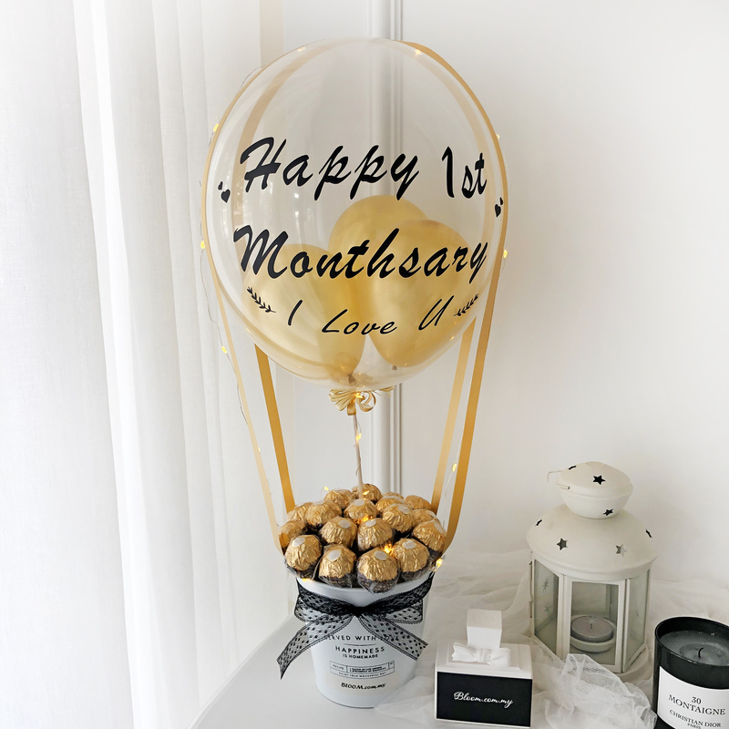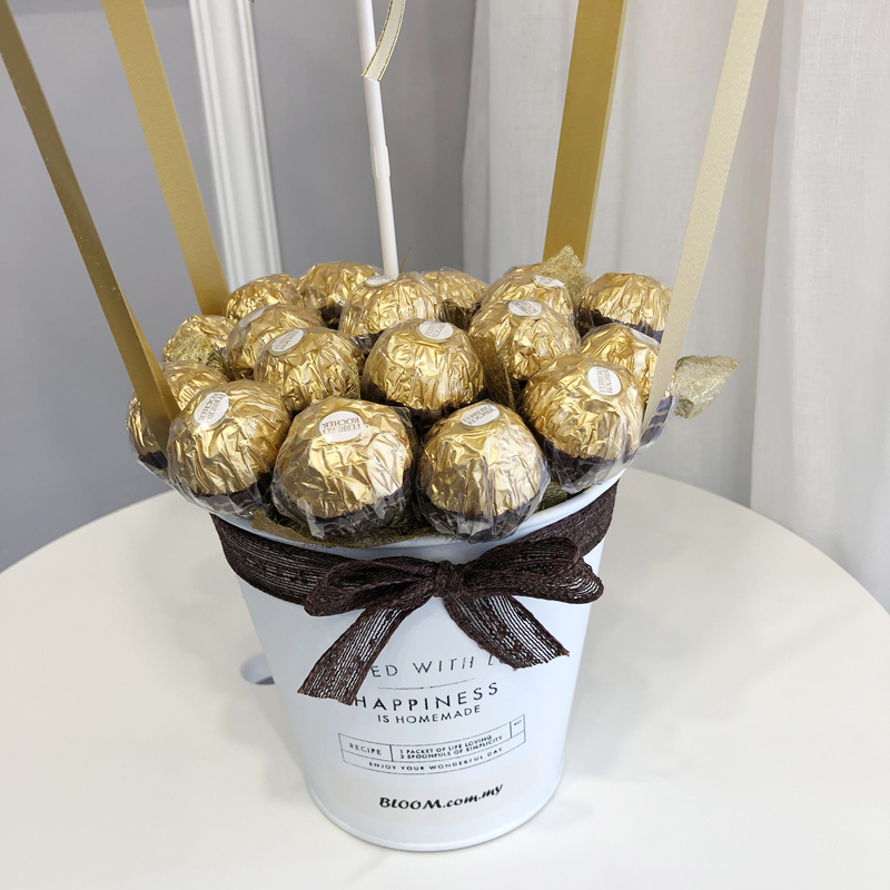 A 20-piece Ferrero Rocher luxury Hot Air Balloon setup. Perfect for birthdays, anniversaries, or any event that merits a bit of sweetness and refinement, this beautiful design.