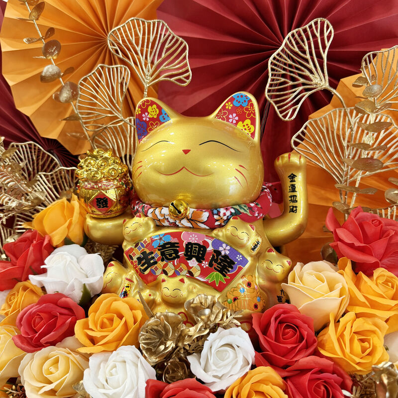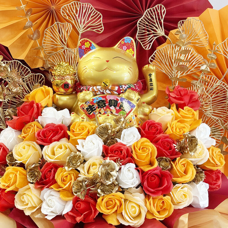 A luxurious Flower Stand with a GOLD Lucky Cat and Soap Roses, symbolising wealth and elegance. Ideal for sharing wishes of success and happiness in a stylish display.