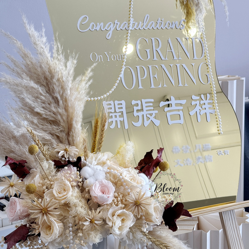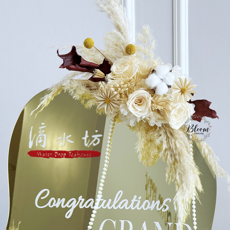Designed to honour new ventures, this special flower stand features preserved flowers, airy pampas grass and textural cotton pods arranged around a gently curved golden mirror. The delicate pearl drape complements the neutral palette which giving the display a serene yet festive aura. At about 150cm in height, it’s a tasteful statement piece for congratulatory moments.