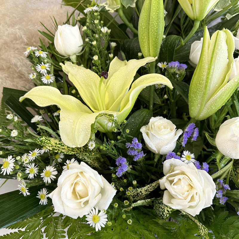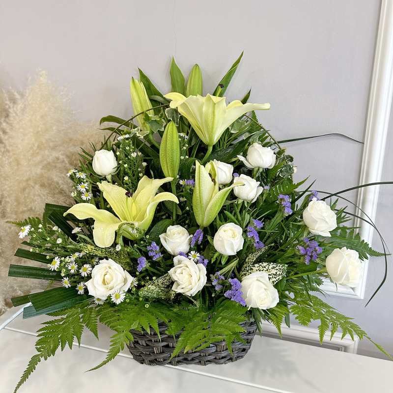 This funeral flower basket showcases prominent Yellow Conca d’Or Lilies alongside elegant White Roses, enriched with soft purple and white floral accents. The vibrant greenery provides a natural backdrop, resulting in a composed and thoughtful tribute for meaningful farewells.