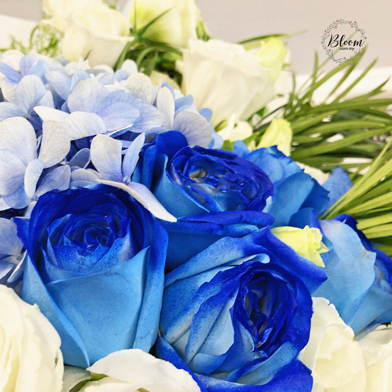 白いトルコキキョウ、12本の青いバラ、青いアジサイの組み合わせが、気品と落ち着きを醸し出すブーケ。