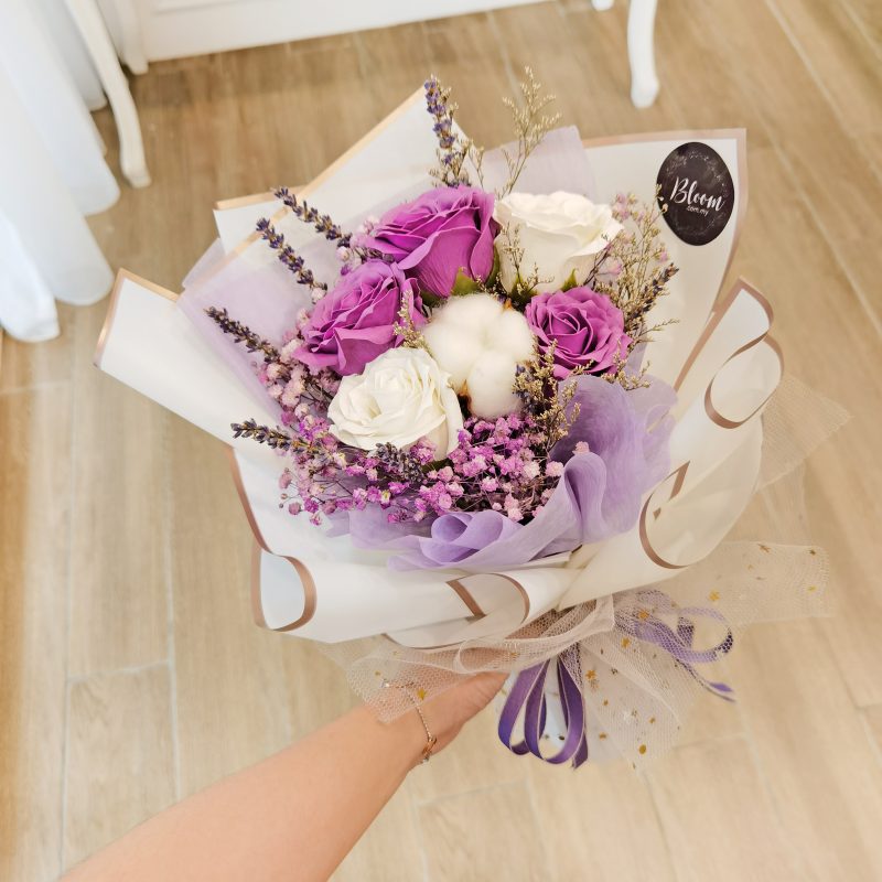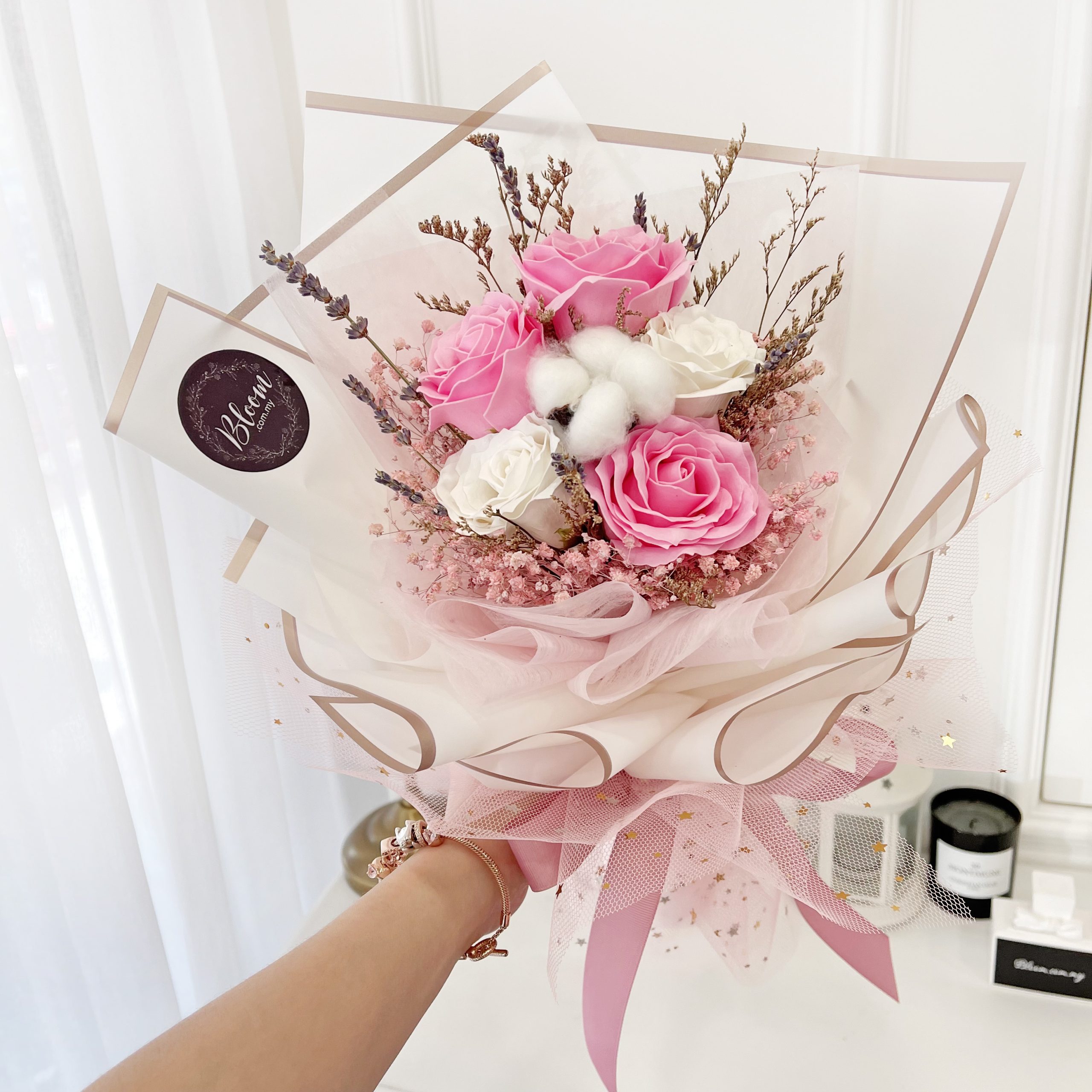 ホワイト2輪、カラー3輪のソープローズとコットンフラワーの美しいプレミアムソープローズブーケ。エレガントでありながらソフトなスタイルで、温かみと魅力が最も大切な特別な日にふさわしいデザインです。 おおよその寸法: 35cm(W) x 40cm(H)