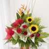 ヘリコニア、ヒマワリ、ガーベラにクラシカルな赤いバラをあしらったフラワースタンド。写真のアレンジメントは一例です。