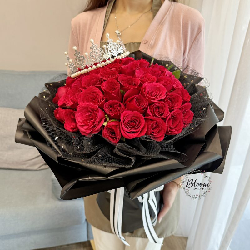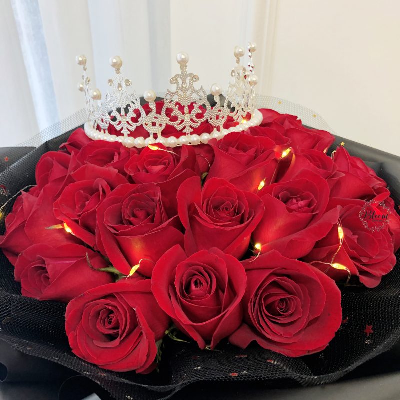24本仕立てと50本仕立てから選べるみずみずしいレッドローズをあしらったブーケは、装飾的な王冠が美しいアクセント。ちょっと贅沢なひとときを楽しみたい方に最適です。写真のアレンジメントは24本と50本のバリエーションですが、その他の色や本数もお選びいただけます。