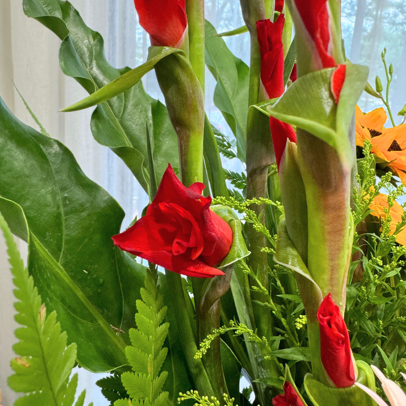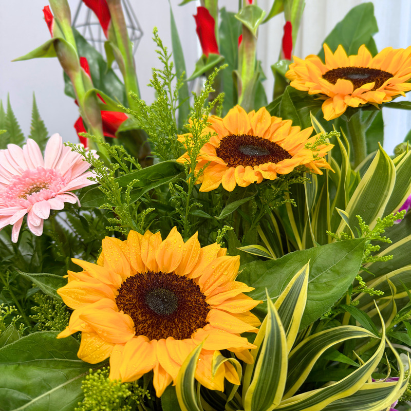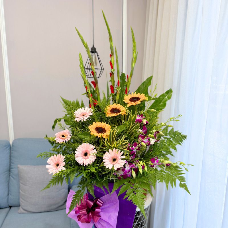 Shop Opening floral stand features a striking blend of Gladiolus, Sunflower, Pink Gerbera and Orchid, creating an uplifting display perfect for grand openings. The arrangement’s lively colours and varied textures bring a refreshing vibrancy, standing tall at approximately 178cm to make a memorable statement.