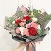 ピンクカーネーション6本、レッドカーネーション3本、トルコキキョウ、カーネーションスプレーのブーケ。 おおよその寸法幅49cm×高さ58cm