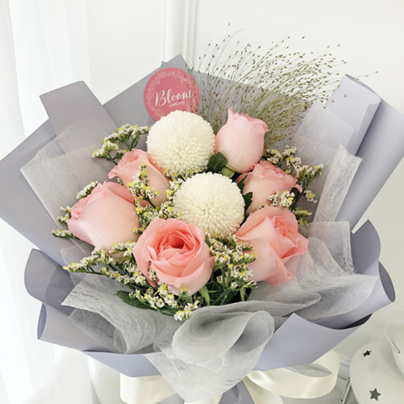 핑크 장미 6줄기, 국화 핑퐁 2줄기, 카스피아를 뿌린 사랑스러운 어레인지입니다. 은은한 매력과 행복한 분위기로 독특하고 비공식적인 이벤트에 모두 잘 어울리는 조합입니다. 대략적인 치수: 40cm(W) x 50cm(H)
