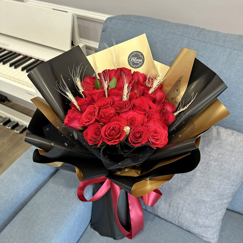 This bouquet combines classic beauty and rustic elegance in one ageless arrangement with 12 stalks of Red Roses and the natural texture of dried wheatgrass.