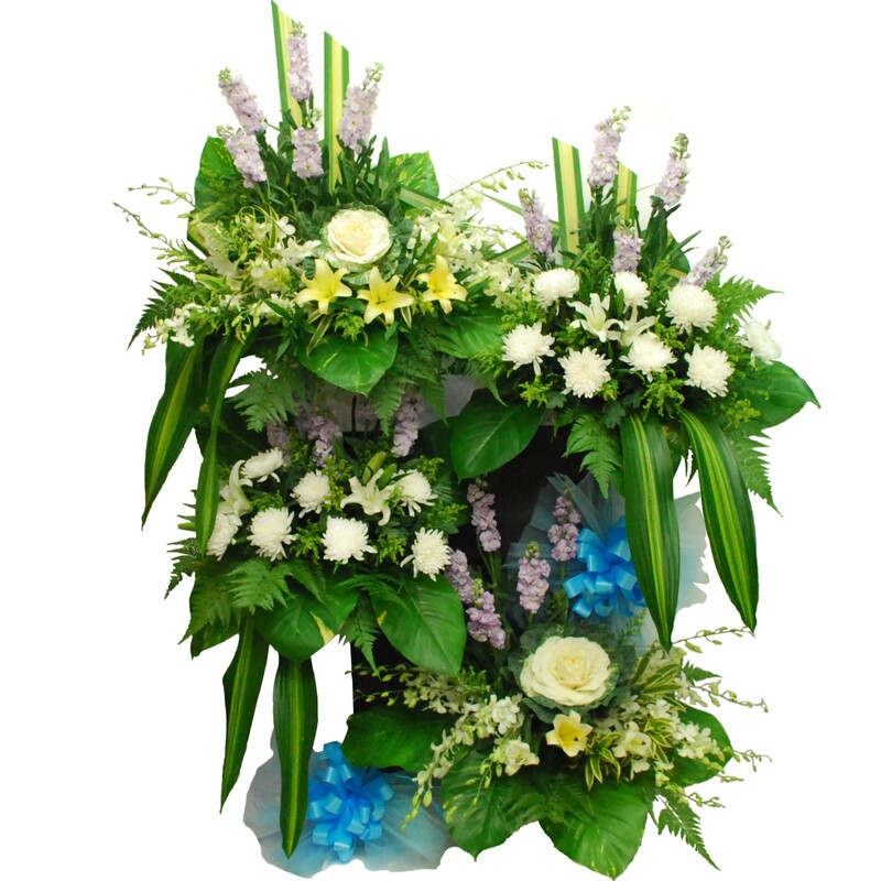 Gubahan bunga takziah kontemporari ini direka dengan gabungan anggun White Casablanca Lily dan Conca d’Or Lily, Chrysanthemum Putih serta Orkid Putih, dihiasi dengan dedaunan hijau yang segar dan sentuhan lembut rona ungu Matthiola serta Brassica. Susunannya yang berstruktur memberikan penampilan moden namun tetap penuh penghormatan, sesuai untuk majlis yang penuh kesyahduan.