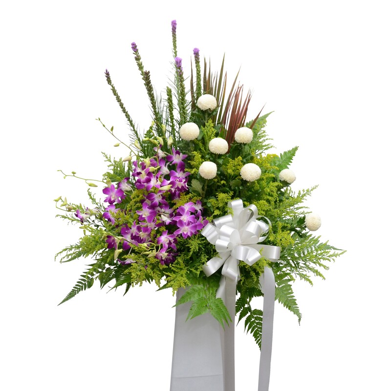 Reka bentuk bunga pengebumian yang bergaya ini menggabungkan bunga Liatris menegak dengan bunga Krisantimum Ping Pong bulat dan orkid yang anggun, menghasilkan paparan yang halus namun semula jadi. Sesuai untuk peringatan yang penuh hormat dan kontemporari.