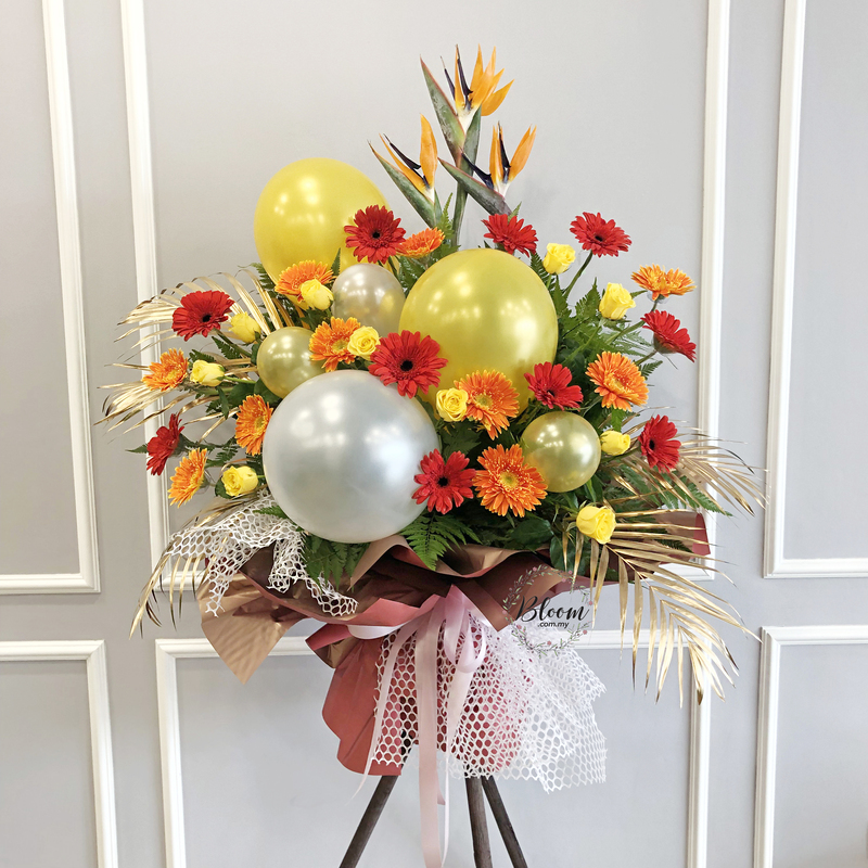 Menampilkan Belon yang suka bermain, Burung Syurga yang berani dan Mawar Kuning yang cerah, gerai bunga ini penuh dengan warna meriah Jingga dan Gerbera Merah. Susunan yang digambarkan adalah satu pilihan, dengan versi lain tersedia untuk disesuaikan dengan majlis.