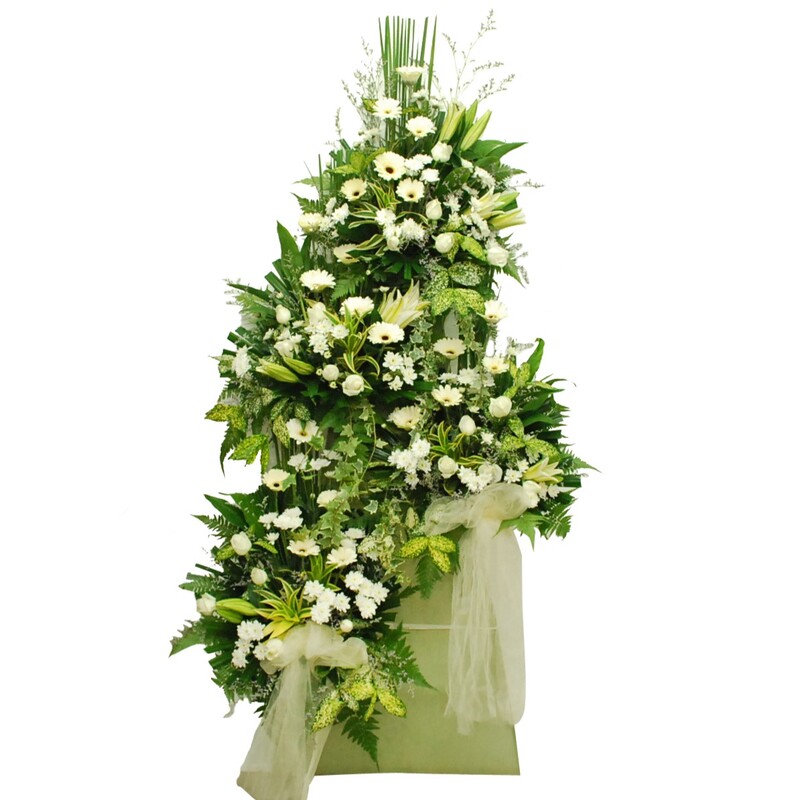 Standing roughly 190cm in height, this tranquil harmony arrangement includes White Casablanca Lily, White Gerbera, White Rose, and White Chrysanthemum Pompom. Its clean and refined structure creates a peaceful tribute, ideal for conveying sincere sympathy with understated beauty.