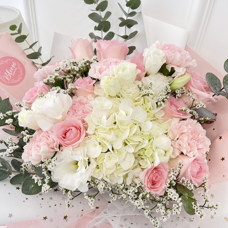 Soft, sweet and just gorgeous! A pastel fantasy come true, this Bouquet of White Eustoma, Pink Roses, Pink Carnations and White Hydrangea Perfect for commemorating love, thankfulness or just brightening someone’s day!