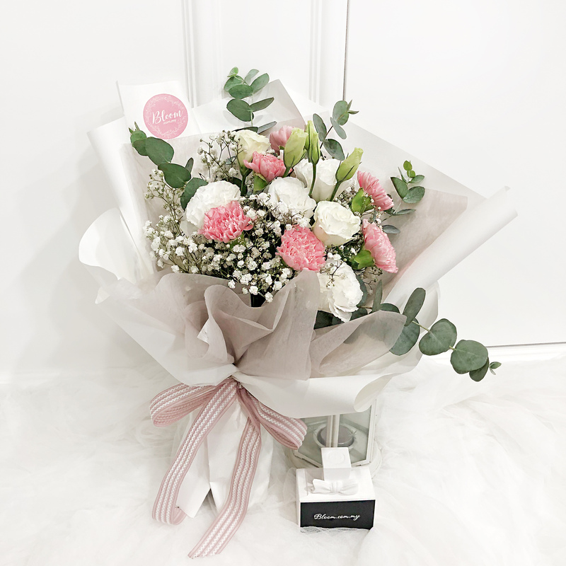 Lovely Bouquet of Carnations, Baby’s Breath and Eustoma is a sincere approach to express affection. Approximate dimension: 48cm(W) x 56cm(H)