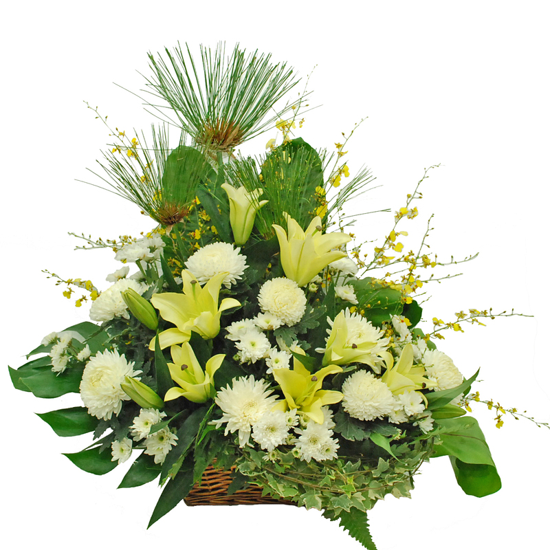 Offering a serene expression of sympathy, this basket combines creamy Conca d’Or Lilies, White Chrysanthemum, White Chrysanthemum pompoms, Broom and delicate Dancing Lady. The subtle yellow highlights and verdant foliage add depth and texture, making it a dignified floral arrangement.