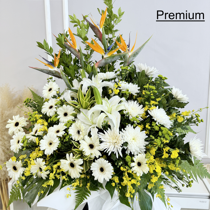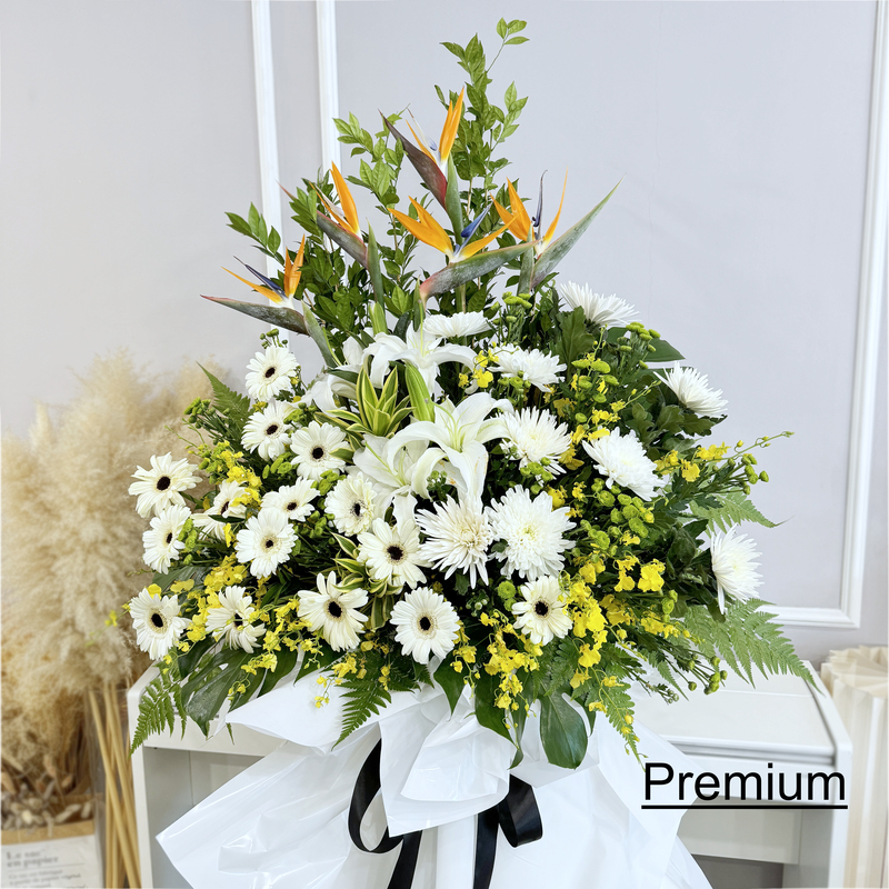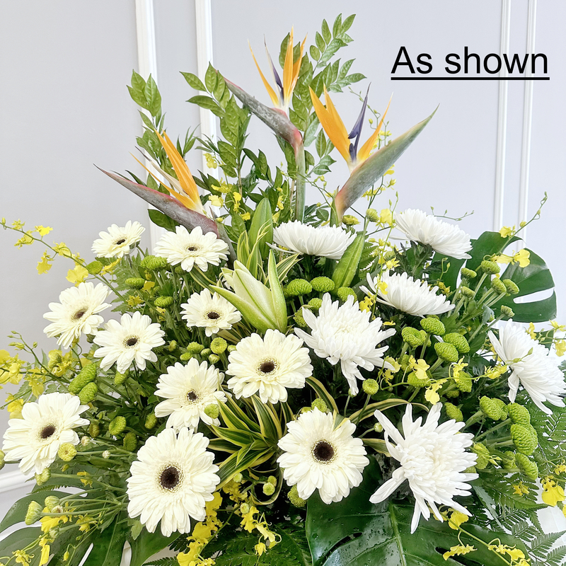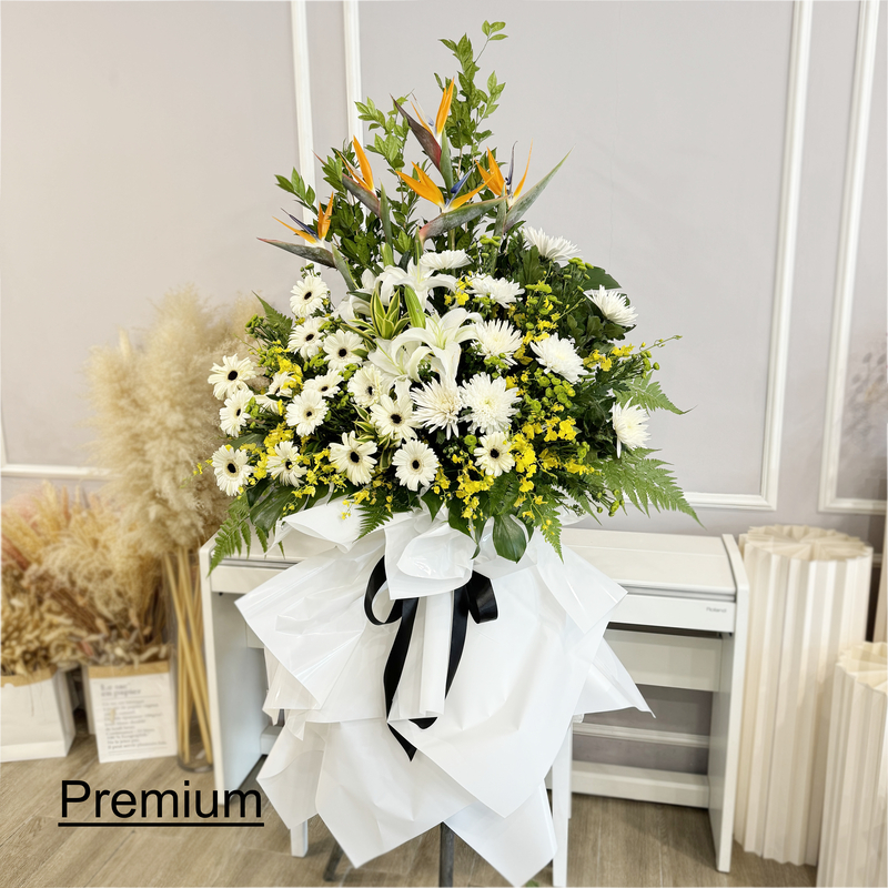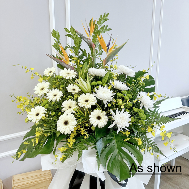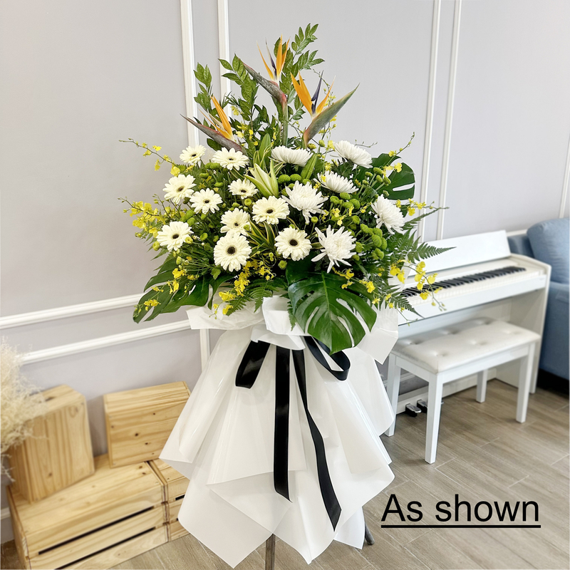 This thoughtful flower stand combines the striking Bird of Paradise with White Gerbera, White Chrysanthemum and vibrant Green Chrysanthemum pompom. Accented by delicate Dancing Lady orchids and Conca d’Or Lily. The arrangement stands about 175cm tall which offering a dignified and heartfelt tribute.