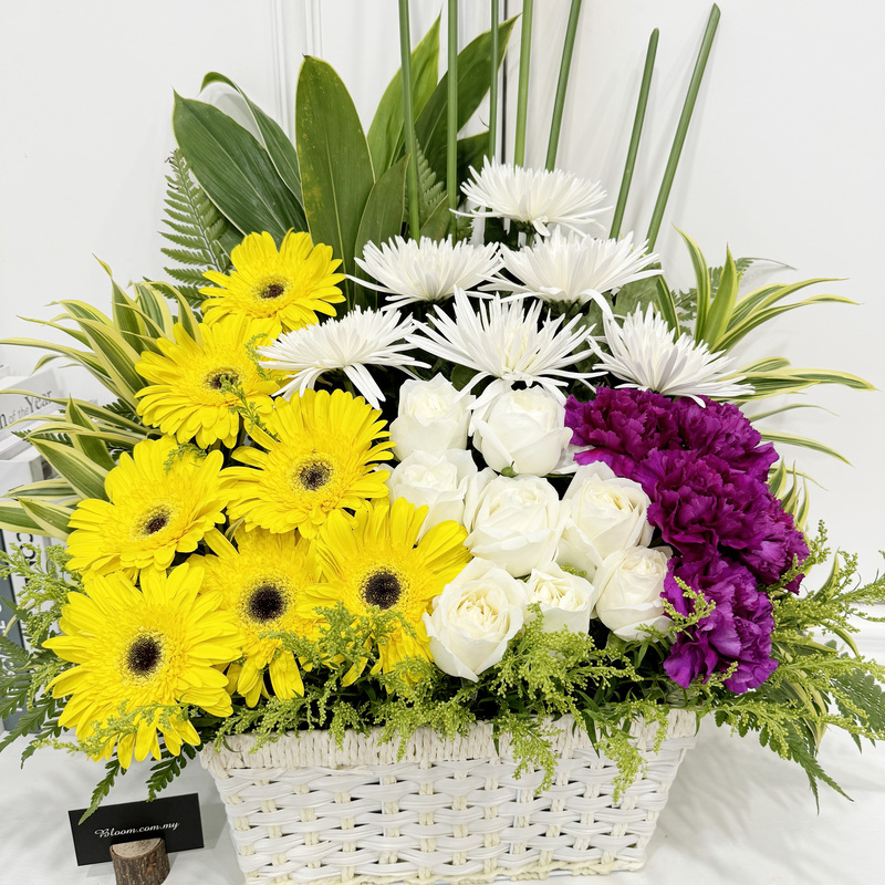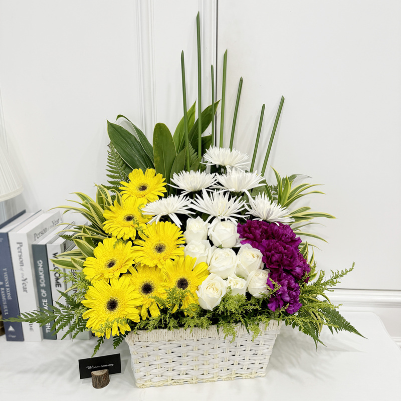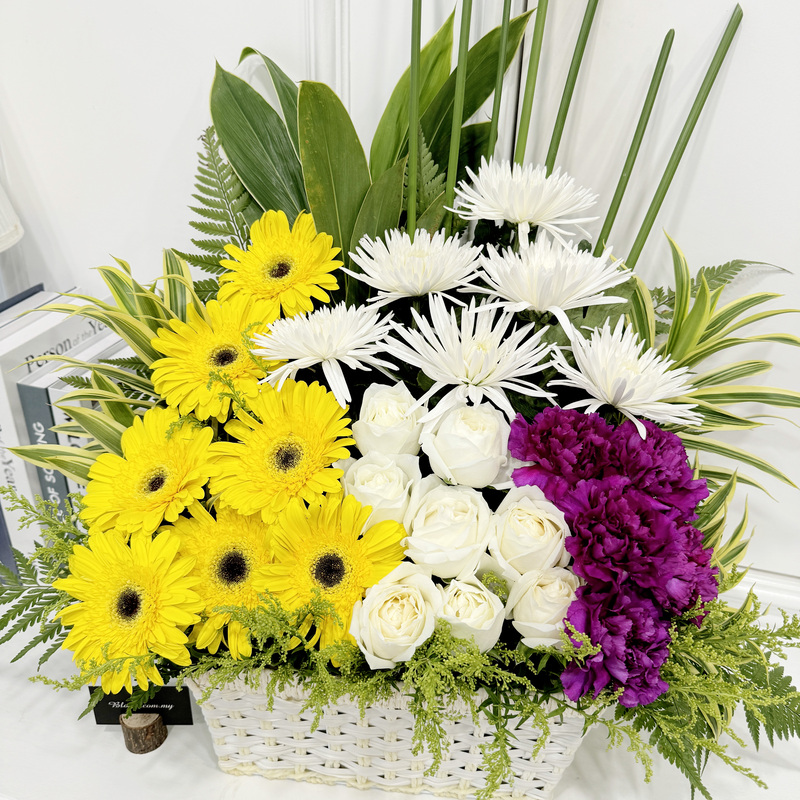 Express heartfelt condolences with this condolences floral basket combining White Chrysanthemum, Yellow Gerbera, White Rose and Purple Carnation. The bright Yellow Gerbera contrasts beautifully with the calming White flowers and deep Purple Carnation, creating a dignified and comforting arrangement.