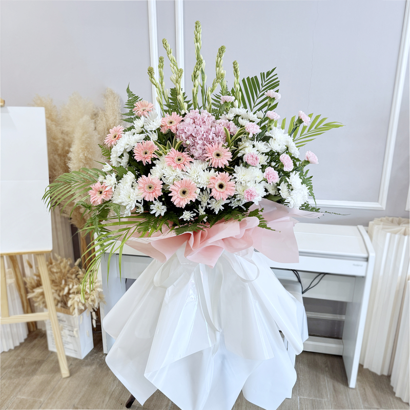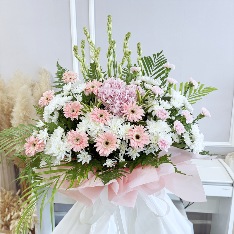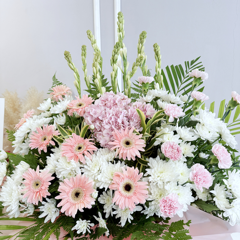 A tender funeral flower stand showcasing Hydrangeas, Tuberoses, Pink Carnations, White Chrysanthemum Pompoms & Pink Gerberas. Arranged with delicate care. The soothing pastel palette and lush greenery provide a comforting presence, standing at around 170cm tall to honour your sentiments.