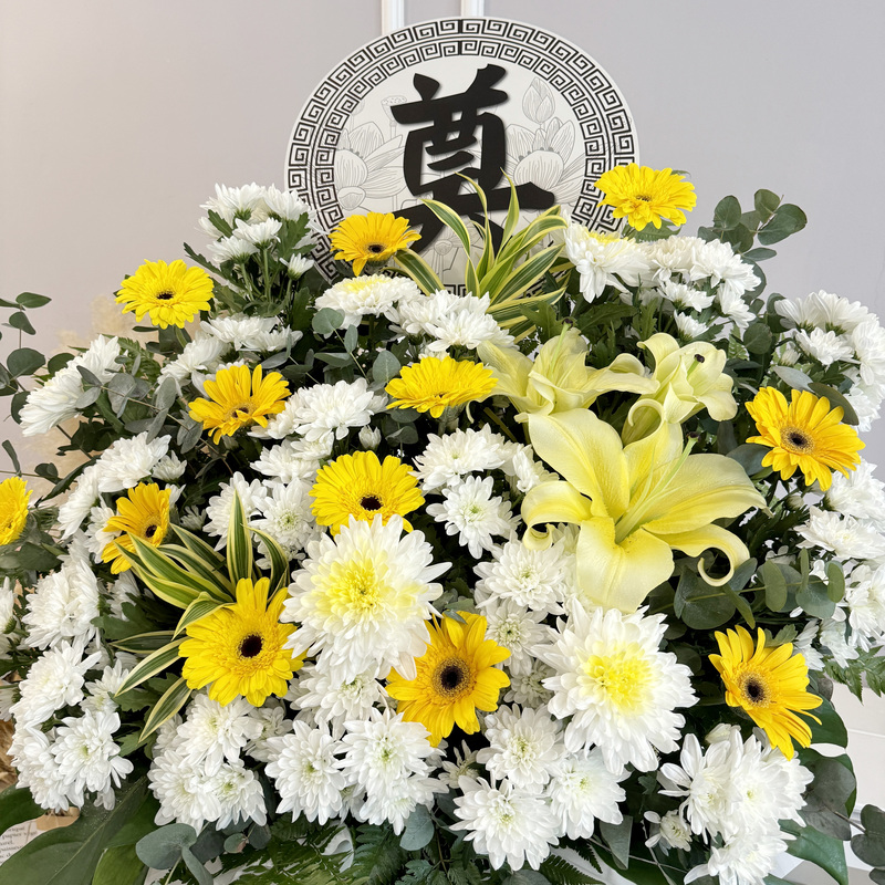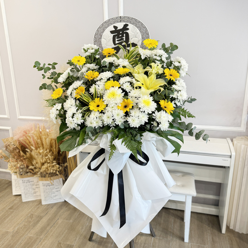 Crafted for moments of remembrance, this funeral stand features a harmonious mix of delicate Yellow Gerbera, pristine White Chrysanthemum Pompom, elegant Chrysanthemum and subtle Conca d’Or Lily. Its height of about 175cm ensures a dignified presence.