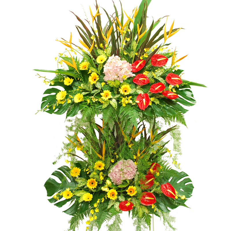 Measuring approximately 220cm in height, this 2 tiers grand congratulations flower stand combines the bold shapes of Heliconia and Red Anthurium with Hydrangea and cheerful Yellow Gerbera. The Dancing Lady orchids add grace, delivering a fresh and uplifting display ideal for celebratory occasions.
