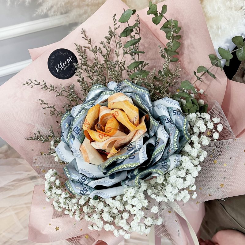 用纸币制作的可爱的金钱玫瑰花束,点缀着干花蕾和蓝色覆盆子,是送给任何重要礼物的美丽而贴心的组合。 大约尺寸45 厘米(宽) x 55 厘米(高)