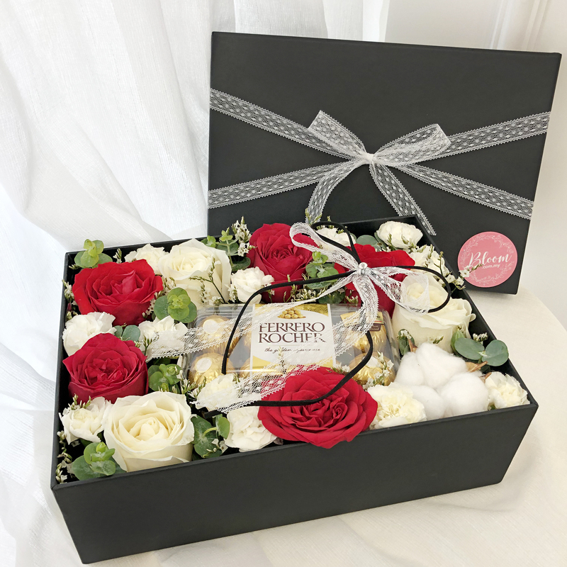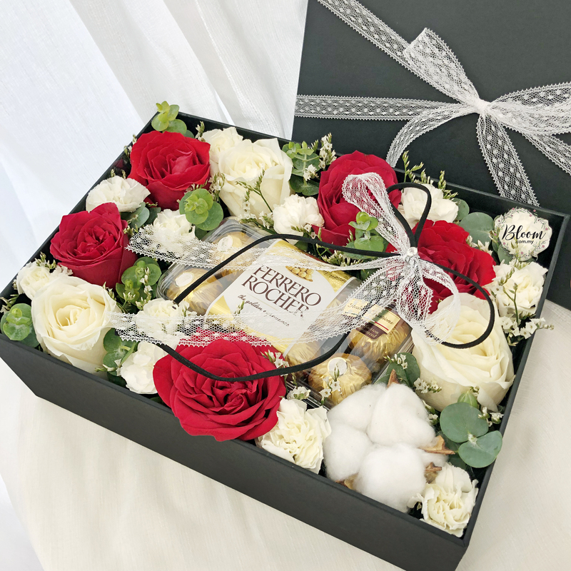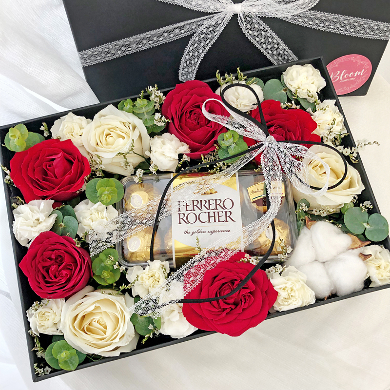 配以玫瑰、康乃馨喷雾和棉花,可爱的盒装插花可容纳 16 块费列罗巧克力。这款独特的插花是分享欢乐和优雅的理想之选。 盒子尺寸:28 厘米 x 20 厘米 x 9 厘米