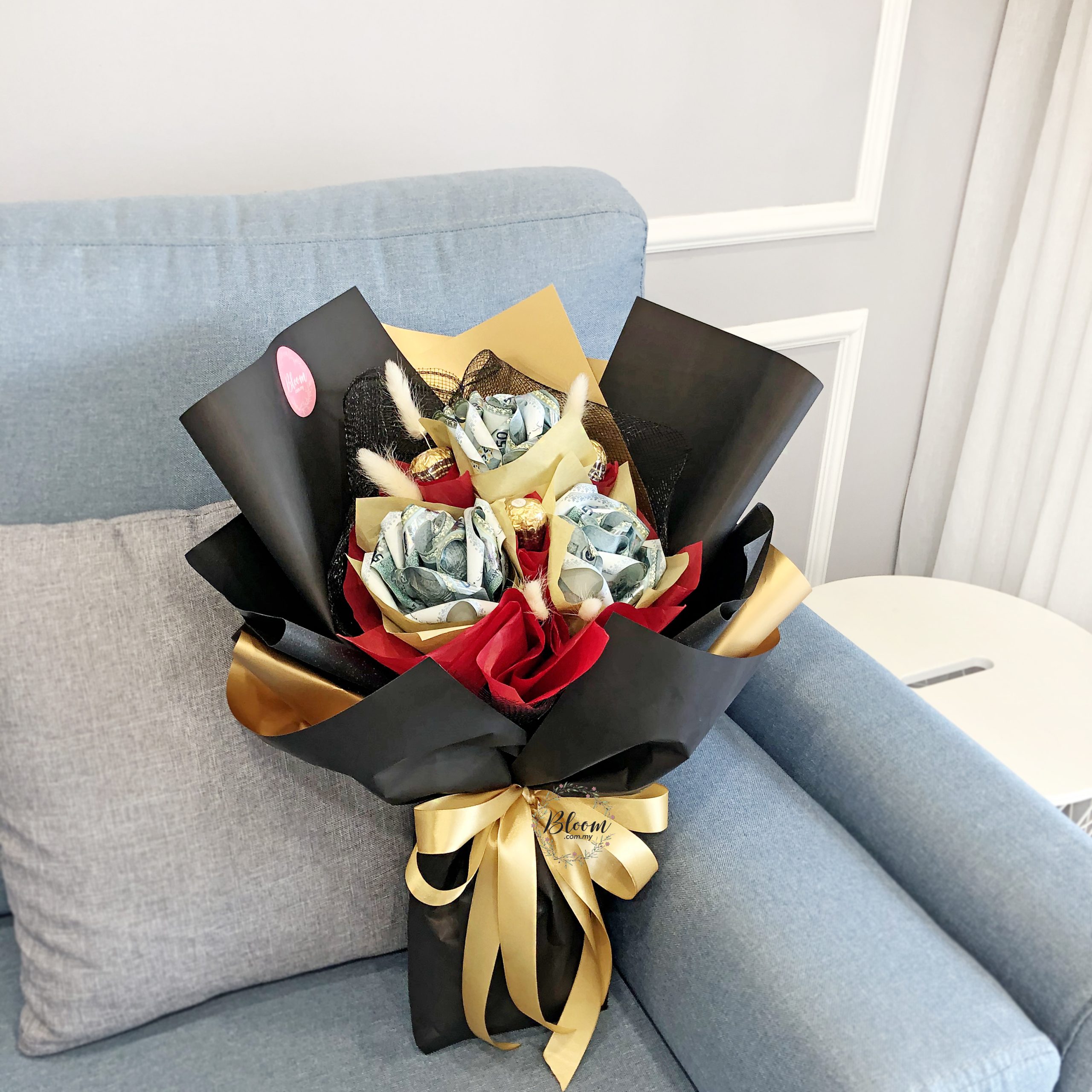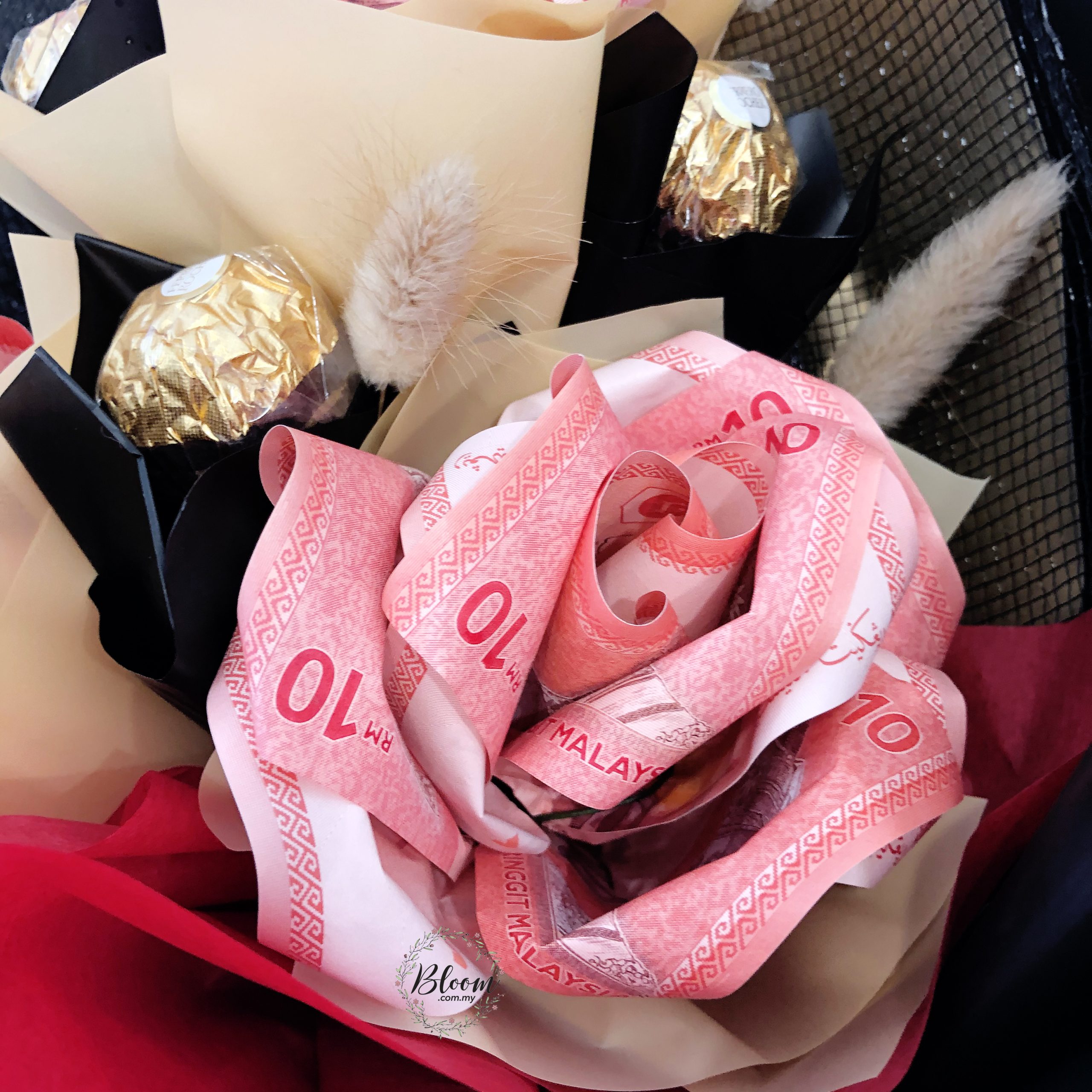 这款花束设计精美,由 3 块费列罗巧克力和 6 张纸币组成的玫瑰花组成。这件作品集优雅与创意于一身,为每场活动增添了独一无二的色彩。 大约尺寸42厘米(宽) x 52厘米(高)