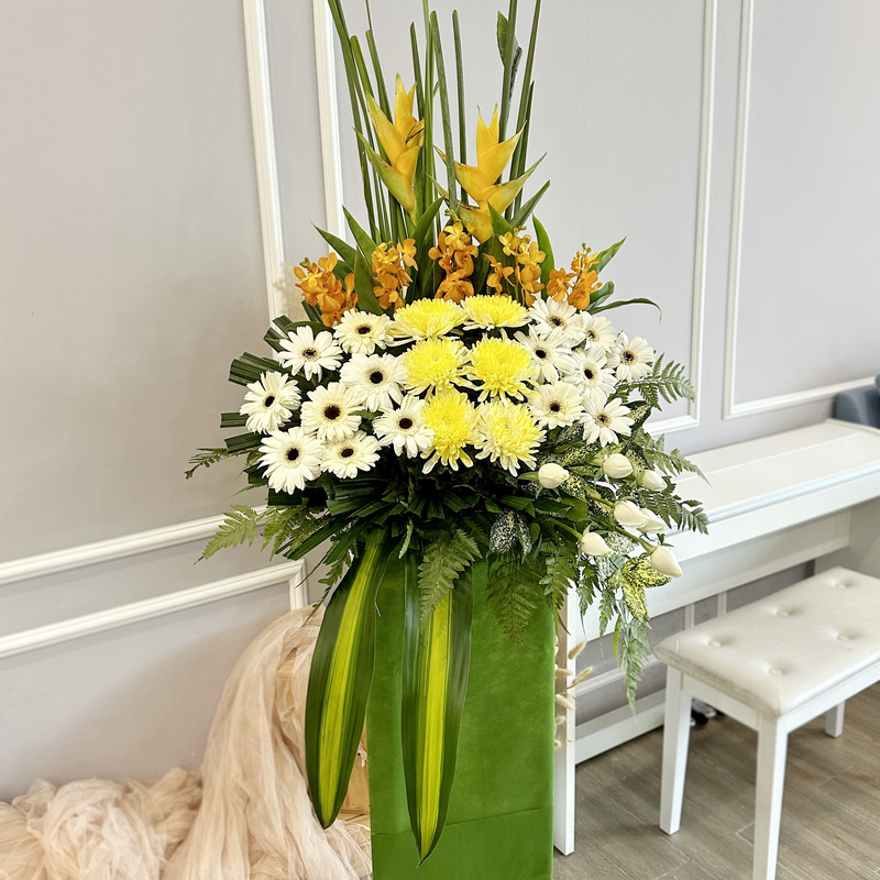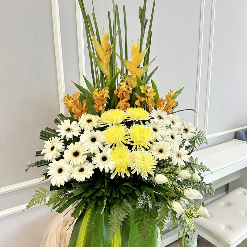 A modern and refined funeral floral display featuring Yellow Chrysanthemum, White Gerbera, White Rose and Crab with Orchid. Standing at around 170cm, this arrangement creates a dignified yet fresh statement for solemn occasions.